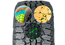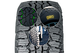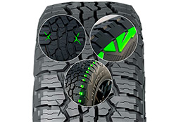 Дизайн протектора разработан для идеального поведения автомобиля на любой дороге. Агрессивные шашки плечевых зон Summit Sidewalls способствуют выгребанию из сложных и рыхлых участков, инновация Canyon Cuts – х-образные канавки, обеспечивающие высокое сцепление на непредсказуемых покрытиях. Широкое расстояние между блоками протектора не дают задерживаться грязи и воде, что также способствует повышению управляемости в разных погодных условиях.